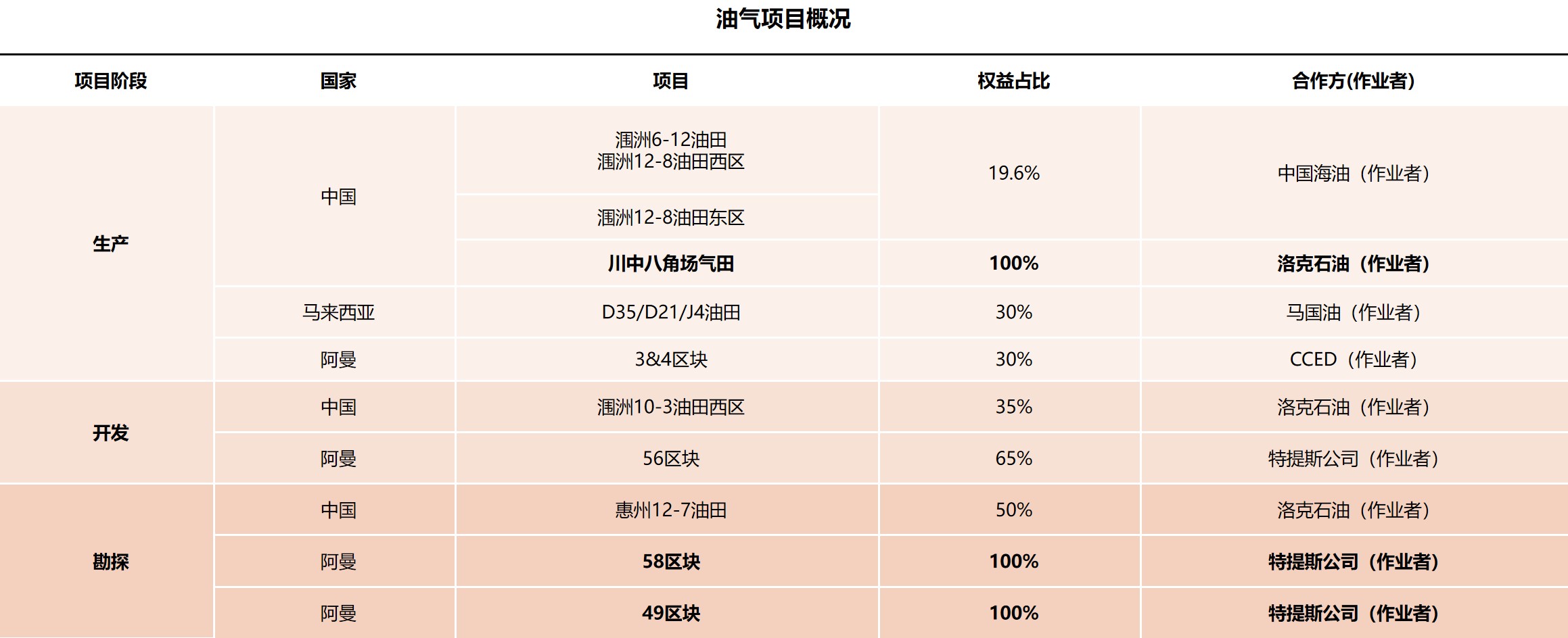 目前主要油氣項(xiàng)目位于中國(guó)四川、南海西部北部灣、南海東部珠江口、馬來(lái)西亞以及阿曼等地,目前日均油氣產(chǎn)量超過(guò)3萬(wàn)桶當(dāng)量。